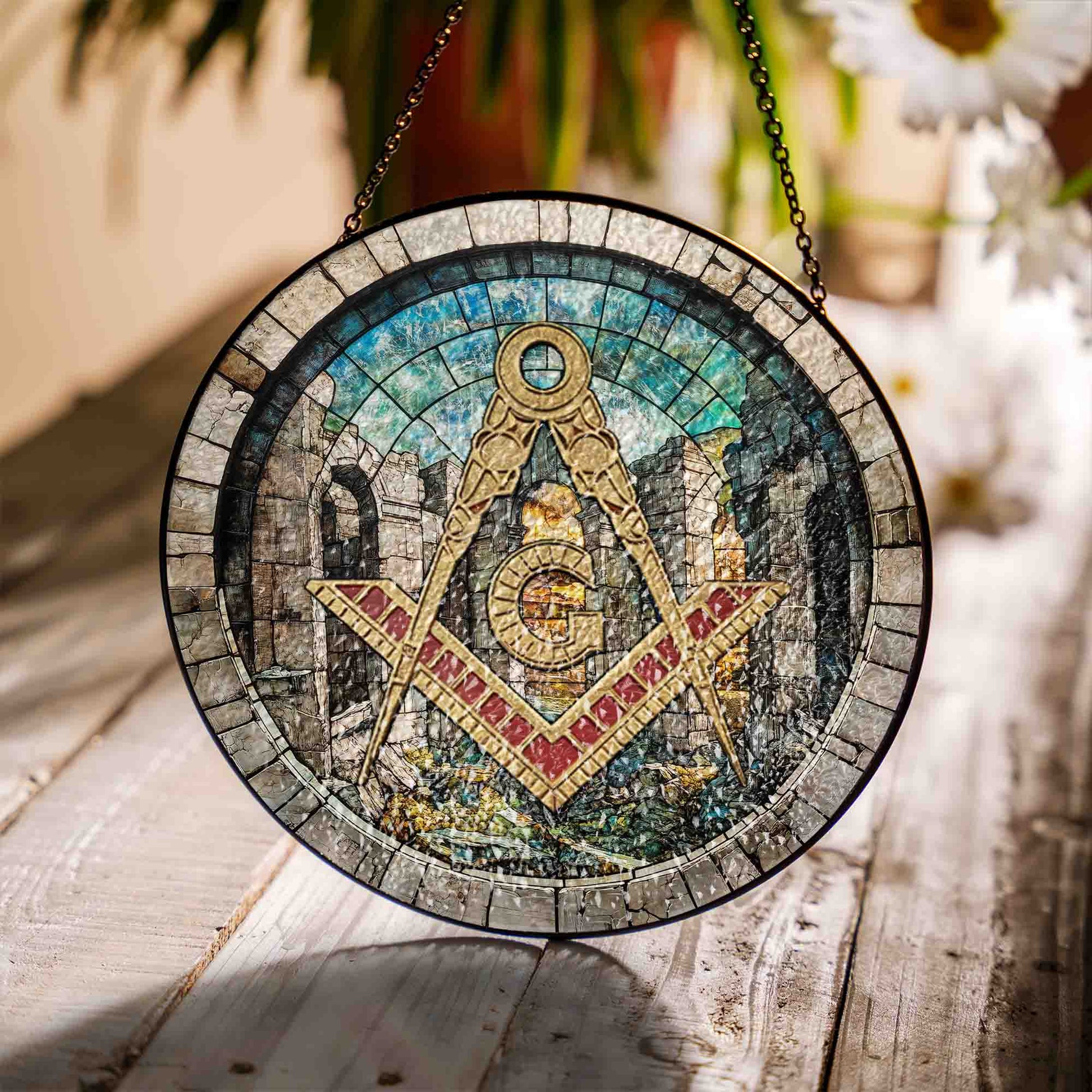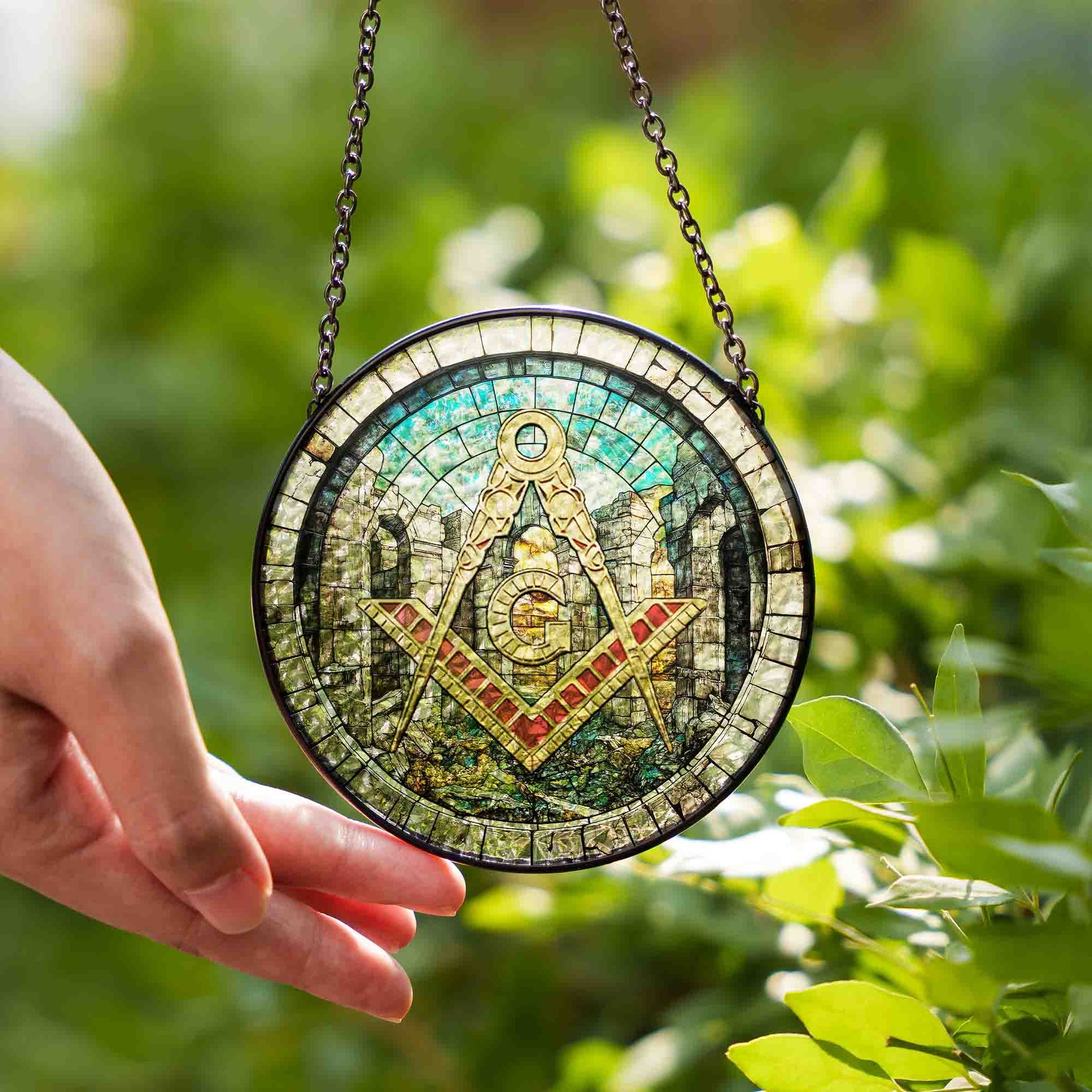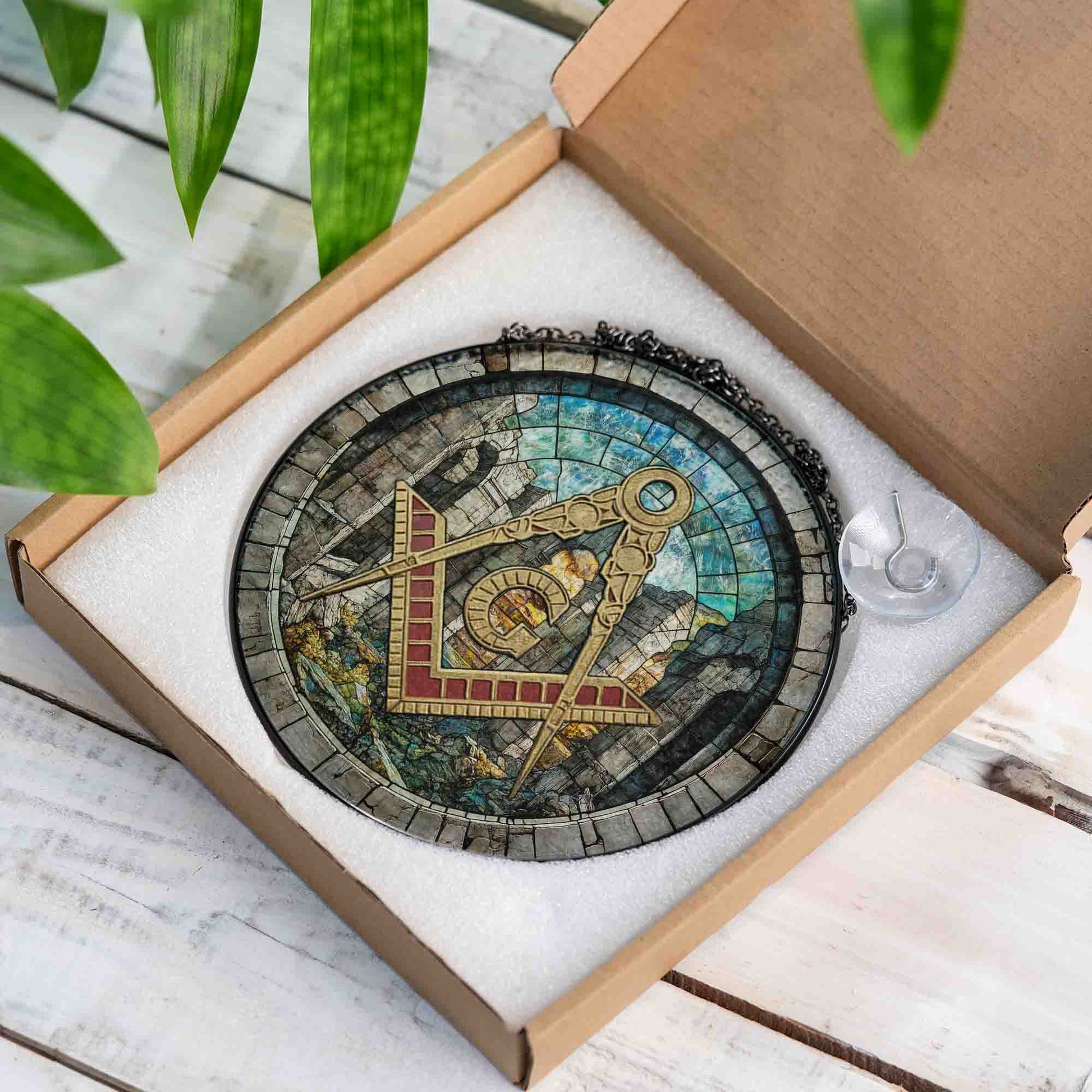 Freemason Symbol Stone Ruins Gray Stained Glass Masonic Suncatcher