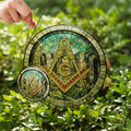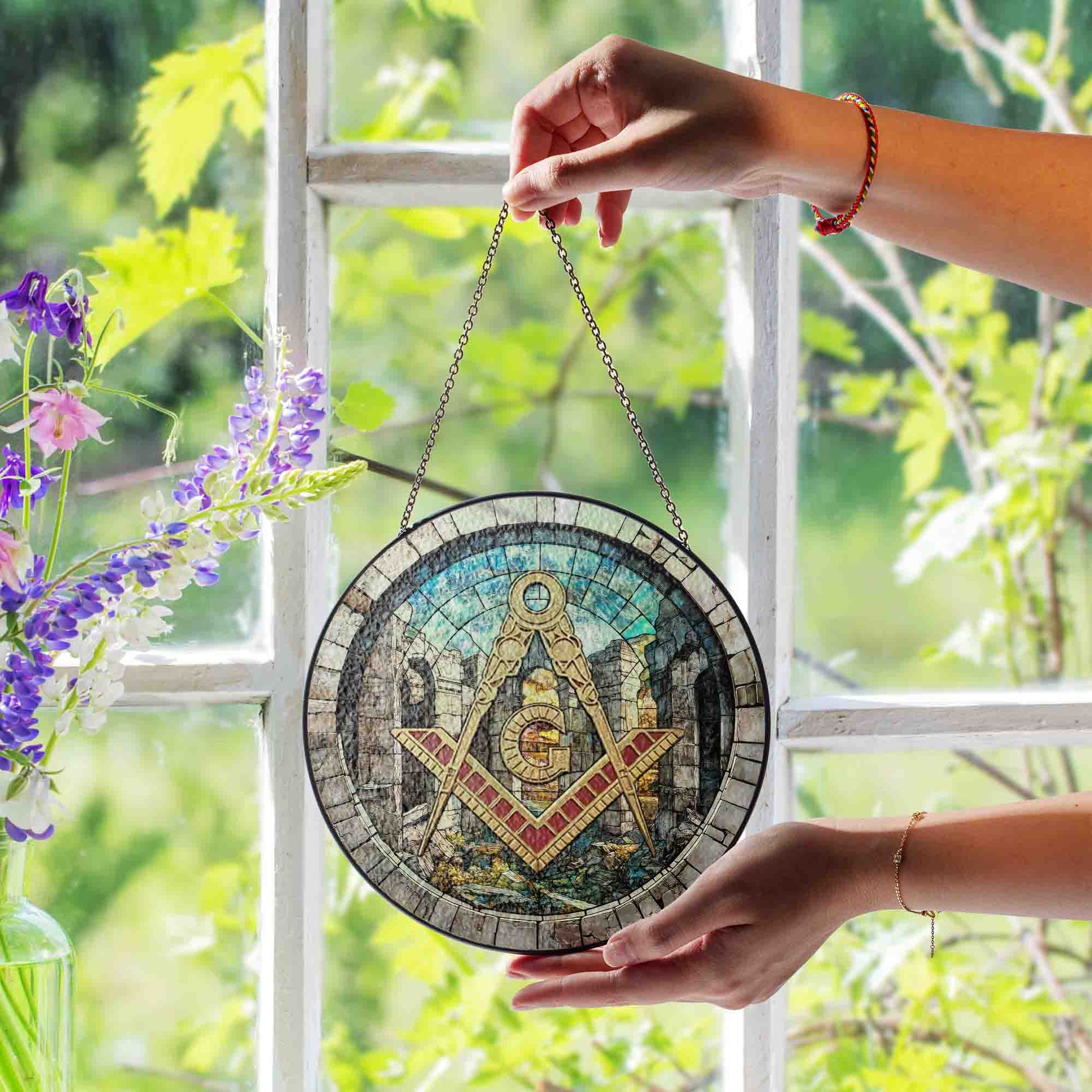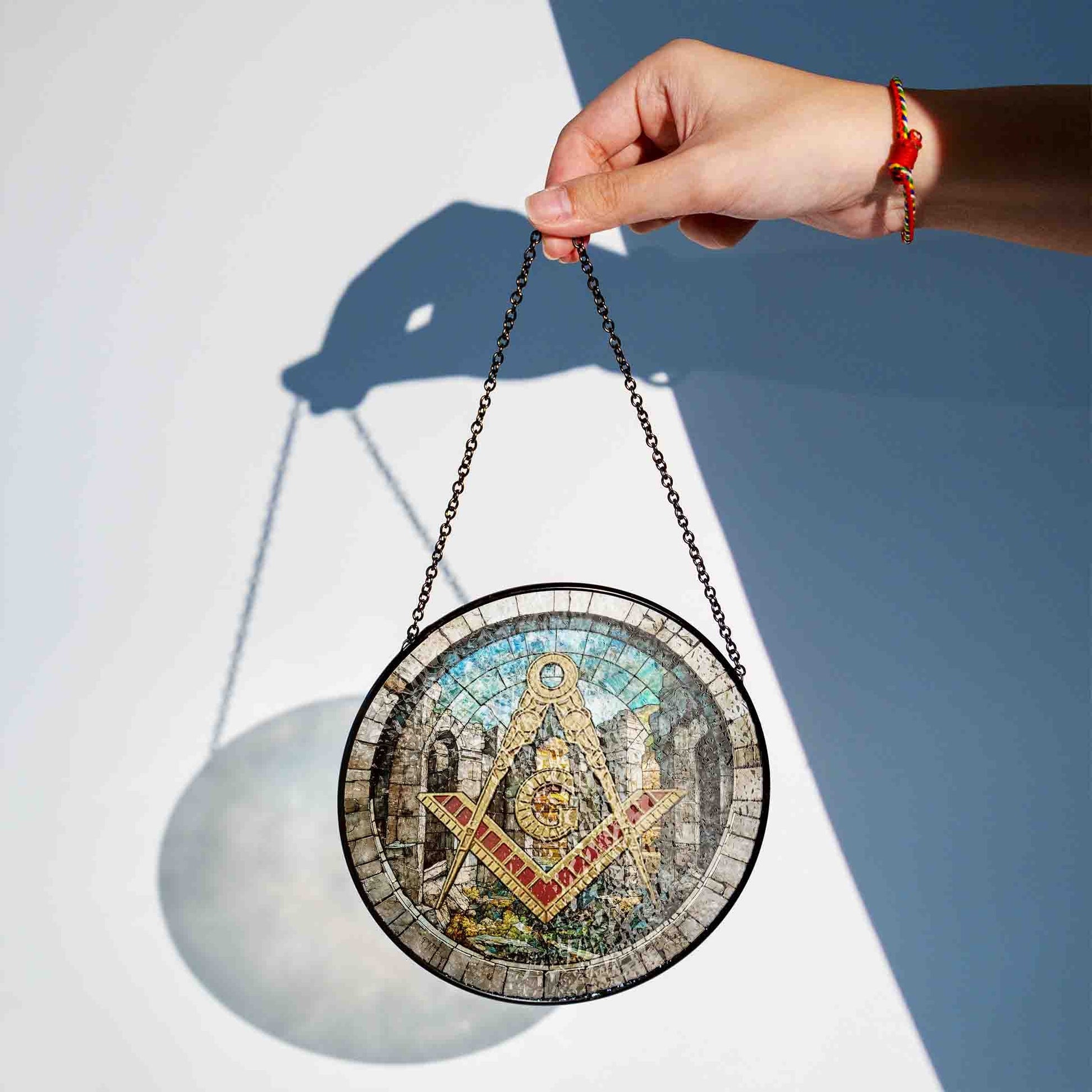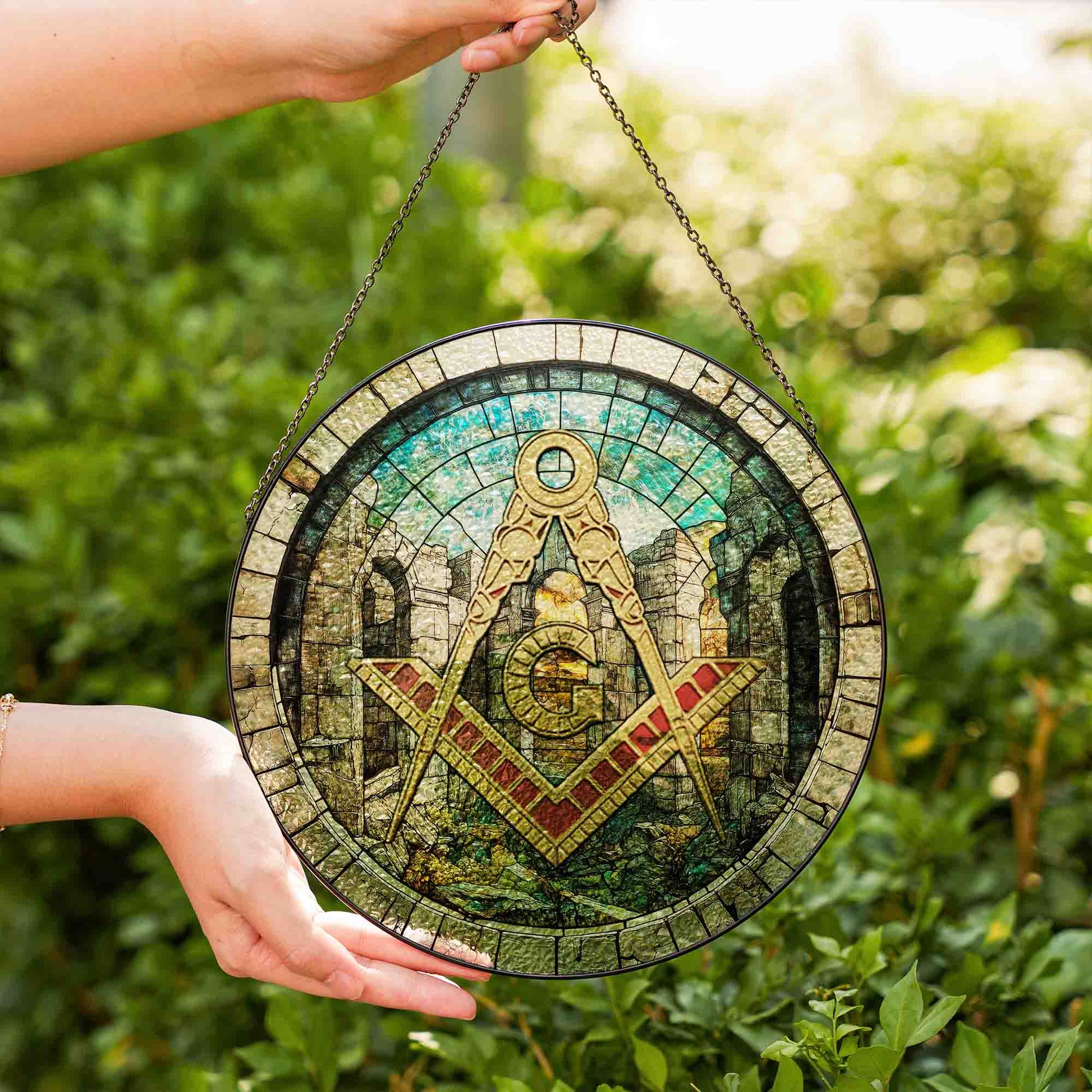 Freemason Symbol Stone Ruins Gray Stained Glass Masonic Suncatcher